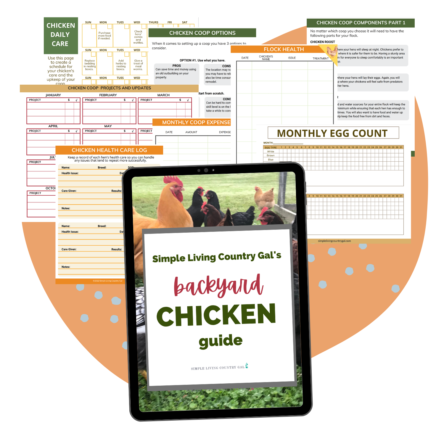 Everything You Need to Raise a Healthy and Happy Flock of Backyard Chickens! 31+ pages that give you everything you need to start and excel at raising backyard chickens. From coop setup, chicken care, record management and more!Â
